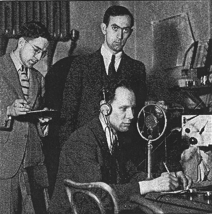 Emile Clavez, W1BUE is at the mike with Ed. Sanders of W1XT behind him. Fred Edwards, W1DJC is at the left.